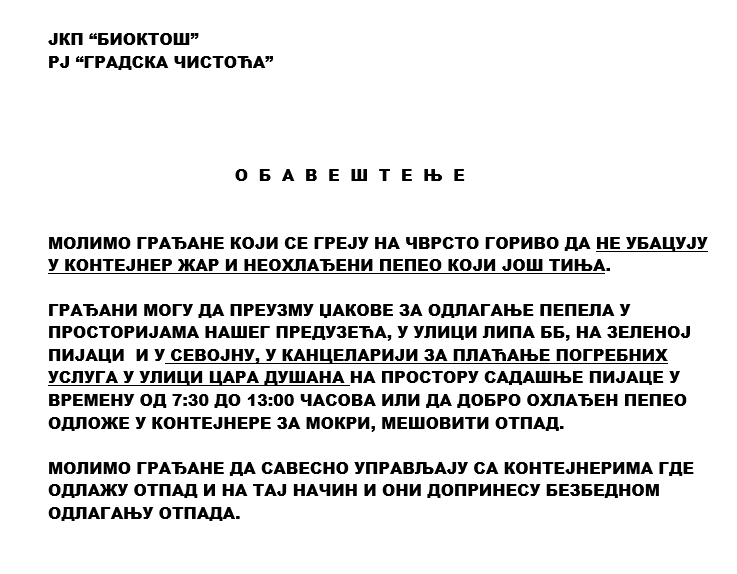 RJ “Javna Higijena” danas odvoz pepela vrši u dva reona u prvoj i drugoj smeni.