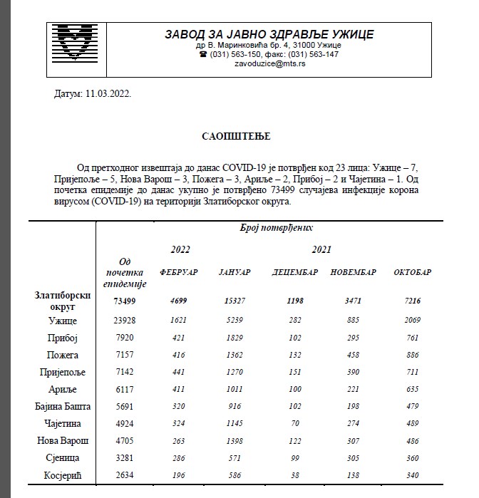 Kod 23 osobe u Zlatiborskom okrugu je potvrđen korona virus kovid-19 za 24 sata, izvestili su iz Zavoda za javno zdravlje Užice navodeći da je u Užicu najviše novoobolelih, sedam.