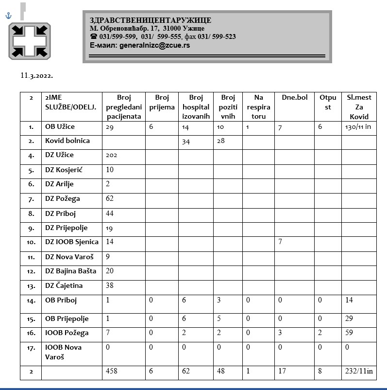 Opao je za blizu deset broj ljudi na bolničkom lečenju u Zlatiborskom okrugu u odnosu na prethodni dan, ali je u isto vreme povećan za jedan broj hospitalizovanih na respiratoru.