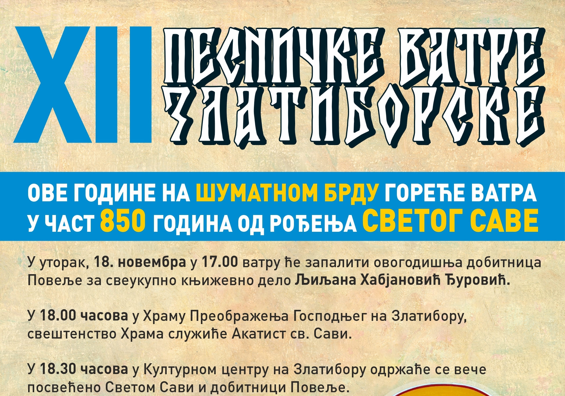 Tradicionalna manifestacija „Pesničke vatre zlatiborske“ u čast 850 godina od rođenja Svetog Save biće održana u utorak, 18. novembra.