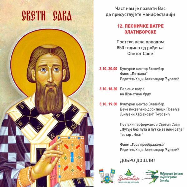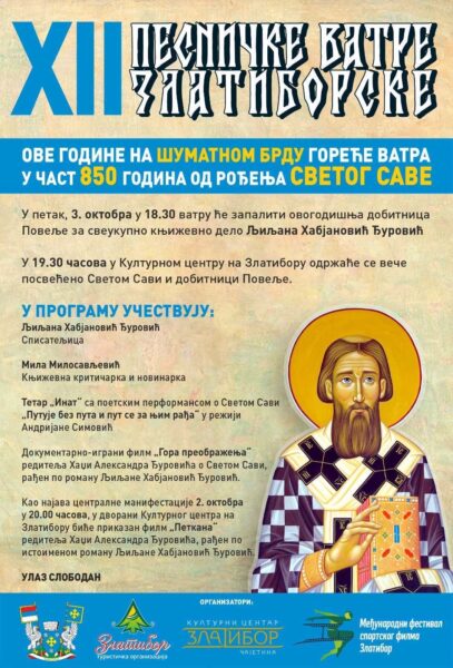 Tradicionalna manifestacija „Pesničke vatre zlatiborske“ biće održana u petak, 3. oktobra, na Zlatiboru, povodom 850 godina od rođenja Svetog Save. Ovogodišnja dobitnica Povelje za sveukupno književno delo je spisateljica Ljiljana Habjanović Đurović, jedna od najčitanijih i najprevođenijih srpskih autorki.