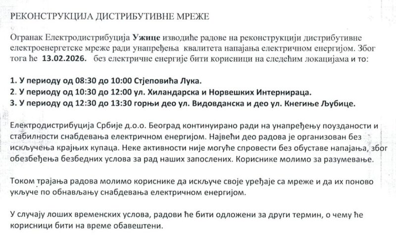 Foto screenshot obaveštenja Elektrodistribucije Užice