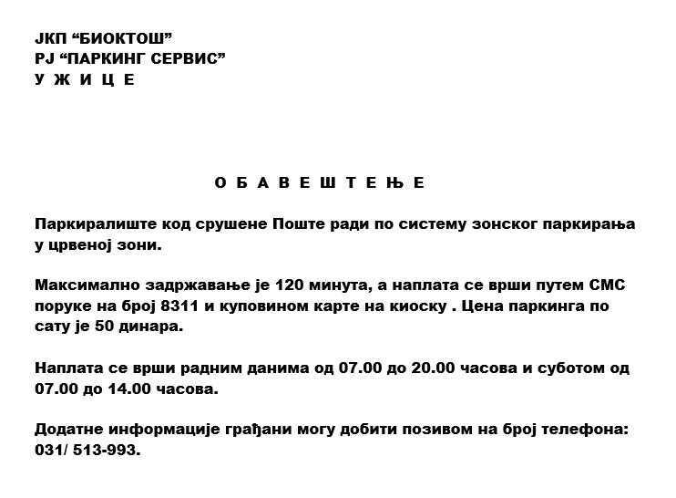 Javno komunalno preduzeće „Bioktoš“ iz Užica saopštilo je da će danas njihove radne jedinice sprovoditi više redovnih i vanrednih aktivnosti na teritoriji grada i okoline, u skladu sa vremenskim uslovima.