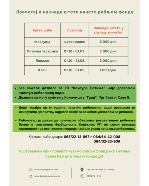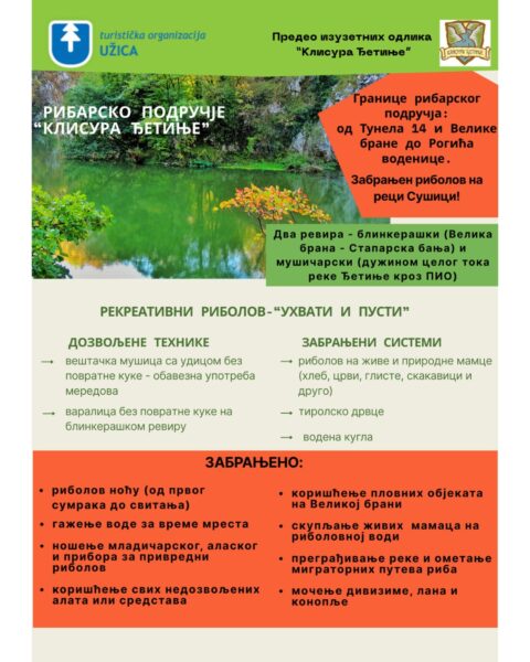Turistička organizacija Užice obaveštava sve zainteresovane građane da je počela prodaja dozvola za rekreativni ribolov za ribarsko područje ”Klisura Đetinje”, u okviru Predela izuzetnih odlika ”Klisura Đetinje”.