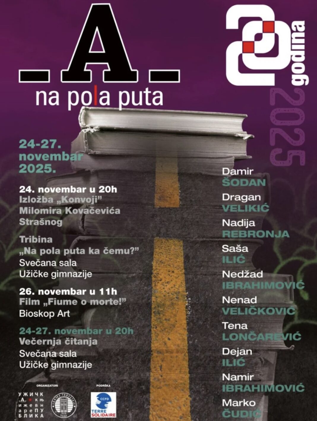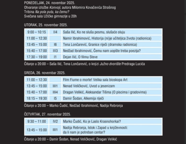 Početna Zlatiborski okrug Užice Počinje XX Međunarodni književni festival „Na pola puta“ Zlatiborski okrugUžiceNaslovna 24. novembar 2025. Objavljeno: 2 sata ranije Počinje XX Međunarodni književni festival „Na pola puta“ Autor: RadioLuna Podelite Facebook Twitter Pinterest WhatsApp Foto: festival.napolaputa Instagram - REKLAMA - U Užicu se od 24. do 27. novembra održava jubilarni XX Međunarodni književni festival „Na pola puta“. Svi događaji održaće se u svečanoj sali Užičke gimnazije, osim projekcije filma koja je zakazana u velikoj sali bioskopa Art. - Advertisement - Tagsfestival na pola putaUžička gimnazija Podelite Facebook Twitter Pinterest WhatsApp RadioLunahttps://www.radioluna.info - REKLAMA - Vremenska prognoza Užice clear sky enter location 5.8 ° C 5.8 ° 5.8 ° 74 % 3.6kmh 8 % Pon 7 ° Uto 11 ° Sre 10 ° Čet 3 ° Pet -0 ° Poslednje vesti Društvo Vlada Srbije obećava da neće biti nestašice naftnih derivata RadioLuna - 24. novembar 2025. - REKLAMA - Dijalog Užice U Centru za privredne inicijative i brza rešenja PKS o problemima lokalne privrede 14. novembar 2025. Srbija i region Pašalić: Oko 90 odsto institucija poštuje preporuke Zaštitnika građana 13. novembar 2025. Zdravlje SRCE: Zašto je javno zdravstvo prepustilo sistematske preglede privatnom sektoru? 12. novembar 2025. Poslednje vesti Društvo Vlada Srbije obećava da neće biti nestašice naftnih derivata 24. novembar 2025. Sport KK Sloboda danas gostuje u Zemunu 24. novembar 2025. Užice 14. sednica Skupštine grada Užica 25. novembra 24. novembar 2025. Užice Počinje XX Međunarodni književni festival „Na pola puta“ 24. novembar 2025. Užice Dve kampanje Udruženja obolelih od mijeloma povezale zajednicu pacijenata u Srbiji 24. novembar 2025. - REKLAMA - Postavite komentar otkaži odgovor Unesite Vaš komentar! molimo Vas unesite Vaše ime Vi ste uneli pogrešnu Email-Adresu molimo Vas unesite Vašu Email-Adresu Save my name, email, and website in this browser for the next time I comment. Δ