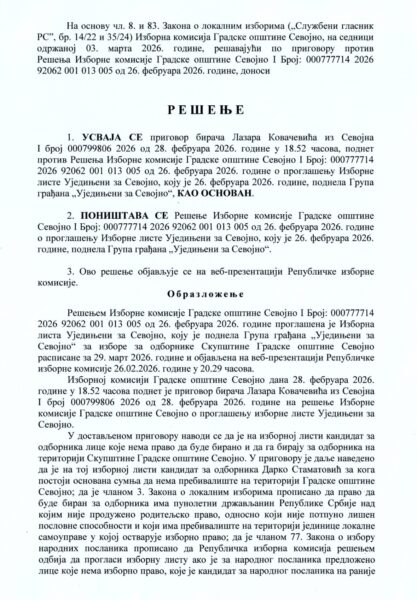 Izborna komisija Gradske opštine Sevojno usvojila je danas prigovor birača Lazara Kovačevića i poništila rešenje o proglašenju izborne liste „Ujedinjeni za Sevojno“, koju je podnela istoimena grupa građana za lokalne izbore u Sevojnu zakazane za 29. mart.