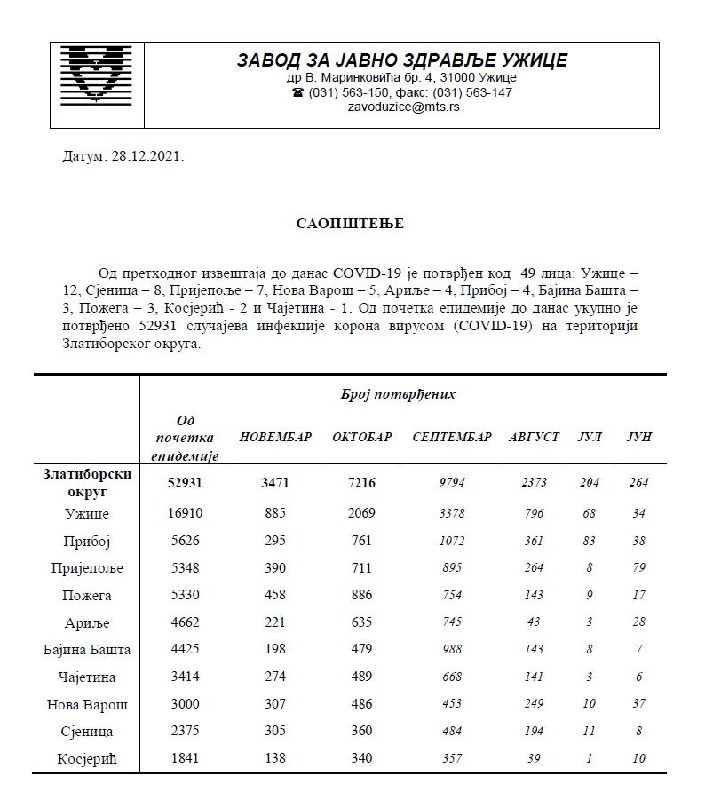 U Užicu je 12 novih potvrđenih slučajeva, dok ostale opštine u okrugu beleže ispod deset novoobolelih.