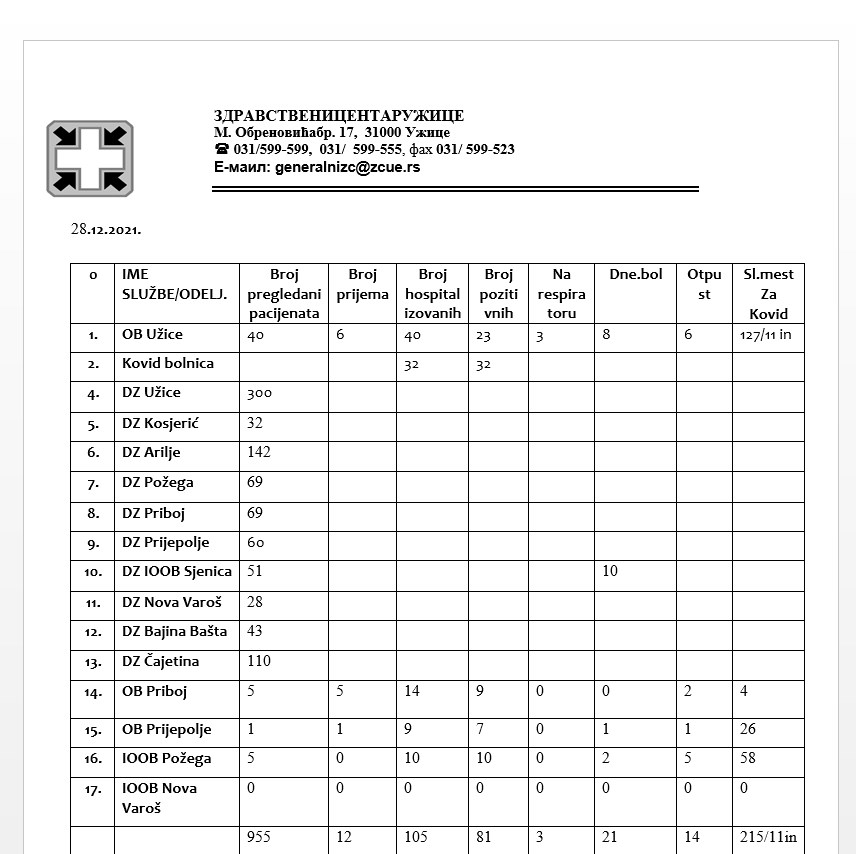 U bolnicama Zlatiborskog okruga na lečenju je 105  pacijenata od kojih je 81  pozitivno na korona virus kovid-19. Na respiratorima u užičkoj bolnici su tri pacijenta. U kovid ambulantama u Zlatiborskom okrugu tokom ponedeljka je pregledano 955 obolelih, a dan ranije 355 ljudi.