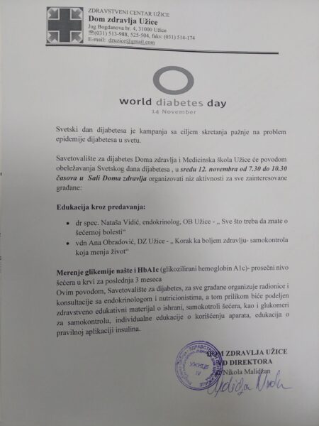 Predavanja i konsultacije u Domu zdravlja povodom Svetskog dana dijabetesa