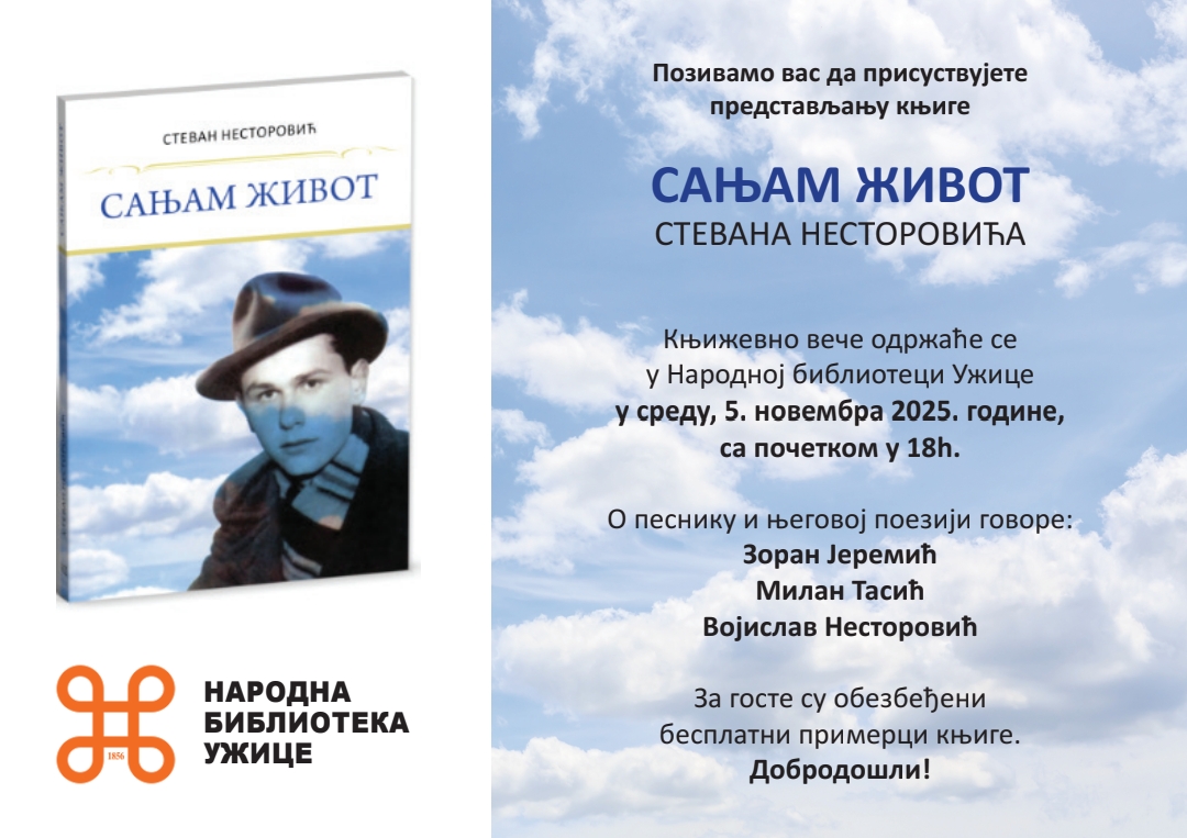 U Užicu će u sredu, 5. novembra, u 18 časova u Čitalištu Narodne biblioteke biti održano književno veče posvećeno predstavljanju knjige „Saņjam život“ autora Stevana Nestorovića.