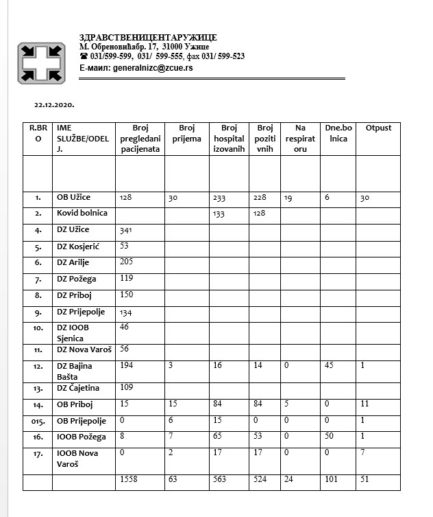 U Opštoj bolnici Užice se leči 233 pacijenata, od kojih je 228 pozitivnih na kovid-19. U kovid bolnici u Krčagovu ih je 133, od čega 128 sa korona virusom kovid-19.