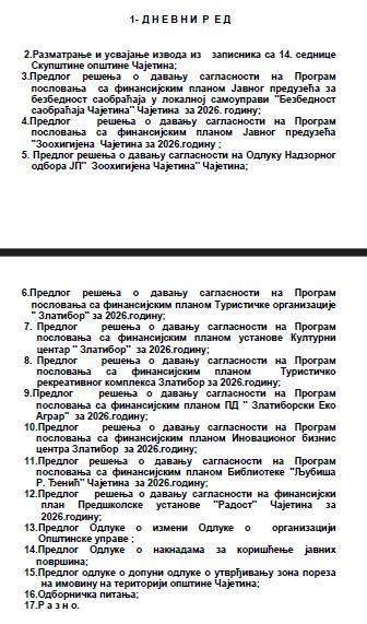 Početna Zlatiborski okrug Zlatibor/Čajetina Programi poslovanja pred odbornicima 25. decembra Zlatiborski okrugZlatibor/Čajetina 24. decembar 2025. Objavljeno: 2 sata ranije Programi poslovanja pred odbornicima 25. decembra Autor: RadioLuna Podelite Facebook Twitter Pinterest WhatsApp - REKLAMA - Sednica Skupštine opštine Čajetina, 15. po redu, biće održana 25. decembra od 10 sati. Pred odornicima će biti oko 15 tačaka dnevnog reda i rasprave oko programa poslovanja javnih preduzeća i ustanova. Foto screenshot - Advertisement - TagsSkupština opštine Čajetinaskupštinska sednica Podelite Facebook Twitter Pinterest WhatsApp RadioLunahttps://www.radioluna.info - REKLAMA - Vremenska prognoza Užice overcast clouds enter location 3.1 ° C 3.1 ° 3.1 ° 96 % 1.5kmh 100 % Sre 4 ° Čet 3 ° Pet 3 ° Sub 3 ° Ned 0 ° Poslednje vesti Trendovi PIO fond: Od 1. januara 2026. novi uslovi za odlazak žena u penziju RadioLuna - 24. decembar 2025. - REKLAMA - Dijalog Užice Srbija centar Užice: Prijava, jer budžet nije usaglašen sa Zakonom o smanjenju rizika od katastrofa i upravljanju vanrednim situacijama 19. decembar 2025. Užice Skupština o izveštaju DRI: Opozicija zatražila utvrđivanje odgovornih za utrošen novac 15. decembar 2025. Užice Otvoreno pismo: Skupštinska tačka “deponija Duboko” prođe, ali transfer stanica neće 12. decembar 2025. Poslednje vesti Trendovi PIO fond: Od 1. januara 2026. novi uslovi za odlazak žena u penziju 24. decembar 2025. Zlatibor/Čajetina Programi poslovanja pred odbornicima 25. decembra 24. decembar 2025. Bajina Bašta, Požega, Kosjerić, Arilje Kuda danas? 24. decembar 2025. Srbija i region Menjačko tržište u Srbiji uravnoteženo nakon preduzetih mera 24. decembar 2025. Društvo Učenici u Vojvodini od danas na zimskom raspustu, u ostatku Srbije od 31. decembra 24. decembar 2025. - REKLAMA - Postavite komentar otkaži odgovor Unesite Vaš komentar! molimo Vas unesite Vaše ime Vi ste uneli pogrešnu Email-Adresu molimo Vas unesite Vašu Email-Adresu Save my name, email, and website in this browser for the next time I comment. Δ