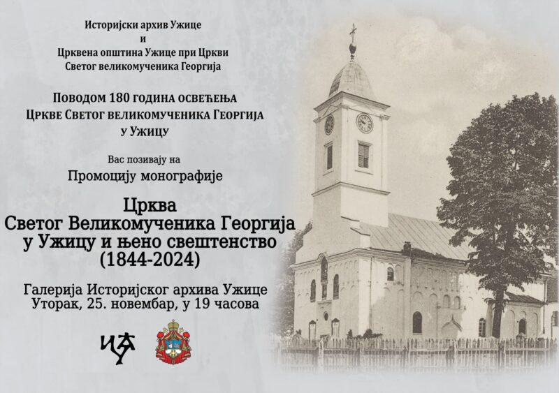 Promocija monografije „Crkva Svetog Velikomučenika Georgija u Užicu i njeno sveštenstvo 1844-2024“ grupe autora: dr Radovana Pilipovića, dr Gordane Lazić, Jane Vasiljević i protojereja Milana B. Filipovića biće upriličena u Istorijskom arhivu Užice večeras od 19 časova.