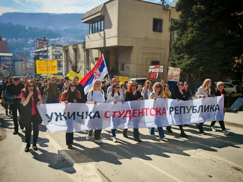 Okupljeni su u 11.30 krenuli ka Vidovdanskoj ulici do zgrade Školske uprave u Užicu. Prosvetari su prilikom šetnje pozivali građane da im se pridruže u generalnom štrajku. Prosvetarima iz Užica pridružili su se i prosvetari iz Arilja u ovoj šetnji.