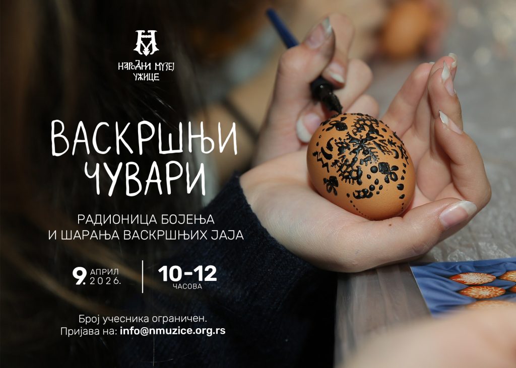 Povodom predstojećeg velikog hrišćanskog praznika Vaskrsa, Narodni muzej Užice u četvrtak, 9. aprila, u periodu od 10 do 12 sati organizuje tematsku radionicu pod nazivom „Vaskršnji čuvari“. Radionica je osmišljena kao kreativni susret, gde će učenici imati priliku da se upoznaju sa tradicionalnom batik tehnikom šaranja jaja, koja podrazumeva nanošenje pčelinjeg voska na ljusku jajeta pre bojenja.