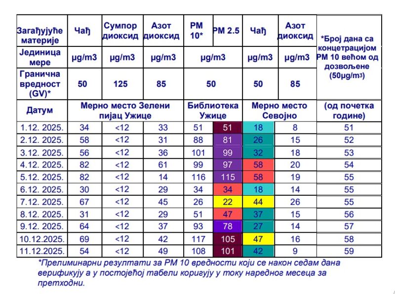 Vrlo loš kvalitet vazduha u Užicu 11. decembra, prema poslednjim podacima Zavoda za javno zdravlje Užice iz lokalne mreže monitoringa kvaliteta vazduha. Na mernom mestu u parku kod užičke biblioteke, tokom tih 24 sata, zabeleženo je prekoračenje dnevno dozvoljenih koncentracija čestica PM2,5 i PM 10 u vazduhu.