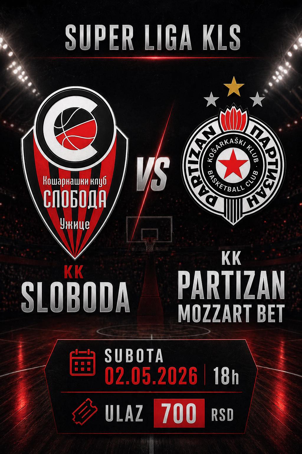 Danas je počela prodaja ulaznica za drugi meč četvrtfinala Super lige Srbije između košarkaša Slobode i Partizana. Karte se mogu kupiti svakog dana (osim 1. maja) od 8 do 20 časova u restoranu Veliki park, koji se nalazi u prostoru sportske hale u Užicu. Karte se mogu nabaviti i na biletarnici hale Veliki park , na dan utakmice od 15 časova. Cena ulaznice je 700 dinara za sve sektore. Sezonske karte važe za ovu utakmicu .