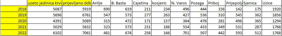 Ona je dodala da je u nekim opštinama prikupljeno manje u nekim više jedinica krvi. Tradicionalno godinama unazad Nova Varoš ima 4,5 posto dobrovoljnih davaoca u odnosu na broj stanovnika i ona je najbolja opština u odnosu na broj davaoca prema broju stanovnika. Do sada u ovoj godini u Novoj Varoši je bilo 298 davaoca. U opštini Arilje je za prvih pet meseci ove godine bilo 180 davaoca, dok je u Bajinoj Bašti bilo 297, u Čejtini je bilo 111 davalaca, Kosjeriću 79, Požegi 215, Priboju 189, Prijepolju 241 davaoc, a u Sjenici 259 i u zadnje tri godine oni su povećali broj davanja tri puta više, a Užice je imalo 700 davaoca.