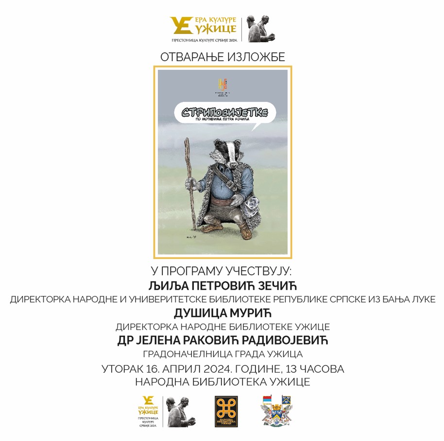 Izložba Stripovijetke, po motivima priča Petra Kočića, autora Milana Mladića i Predraga Ikonića, biće otvorena 16. aprila u 13 sati u Narodnoj biblioteci Užice.