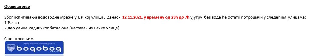 Bez struje biće i subotu potrošači iz Užica koji se električnom energijom snabdevaju sa trafostanica Ankina kafana, ZIP Univer, Igralište, Surduk i tunel Surduk, saopštili su iz Elektrodistribucije Užice.