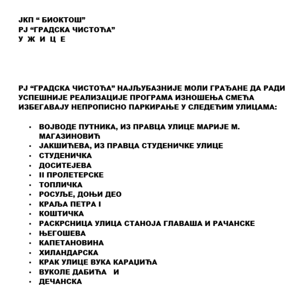Dositejeva, Restoran “Era”, Kralja Petra (od Užičke Republike do Druge Proleterske), Druge Proleterske, Jakšićeva i krak, Pora, Učiteljska, Beogradska, Vidovdanska, Marije M.Magazinović, Miloša Božanovića, Dimitrija Tucovića br.84, Studenička, Vojvode Bojovića, Zlatiborska i Heroja Luna.