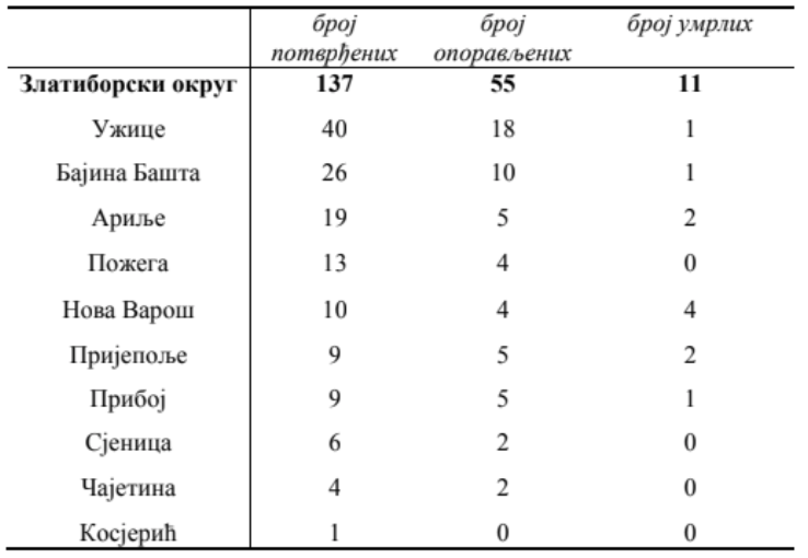 Od poslednjeg izveštaja do danas na području Zlatiborskog okruga testirano je još 140 osoba od kojih je četiri pozitivno na virus COVID-19, dvoje i Požegi i jedno u Čajetini i Bajinoj Bašti.