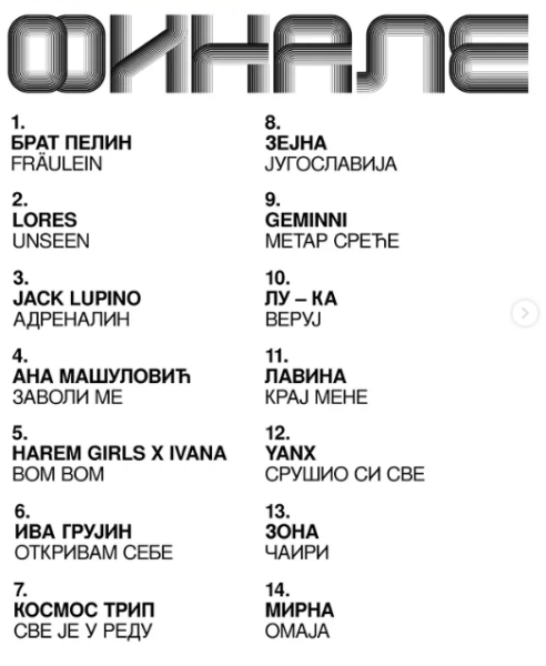 Redosled nastupa u finalu festivala „Pesma za Evroviziju“