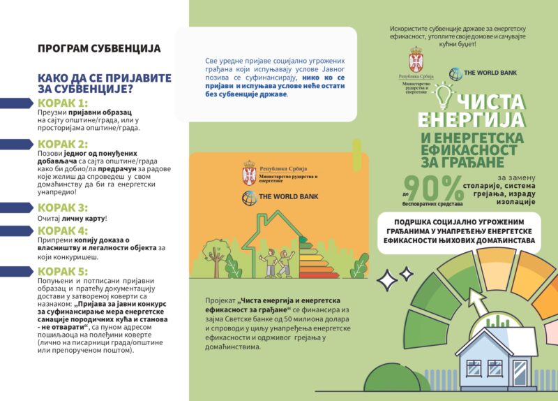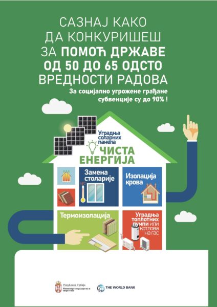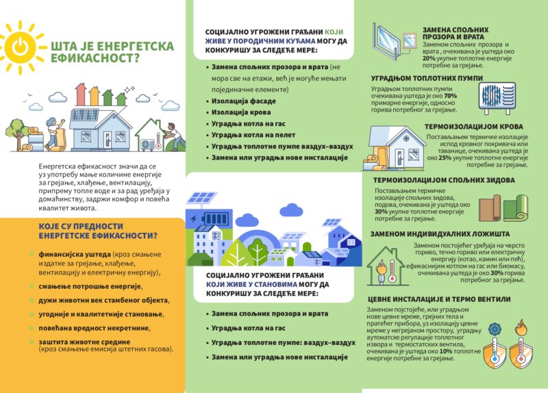 Učestvovanjem u projektu građani mogu da ostvare subvencije u iznosu od 50 do 65 odsto ukupne vrednosti investicije za zamenu stolarije, izolacije, fasade, neefikasnih kotlova, postavljanje solarnih kolektora ili panela za proizvodnju električne energije za sopstvene potrebe, a socijalno ugroženim građanima dostupne su subvencije u iznosu do 90 odsto ukupne vrednosti energetske sanacije.