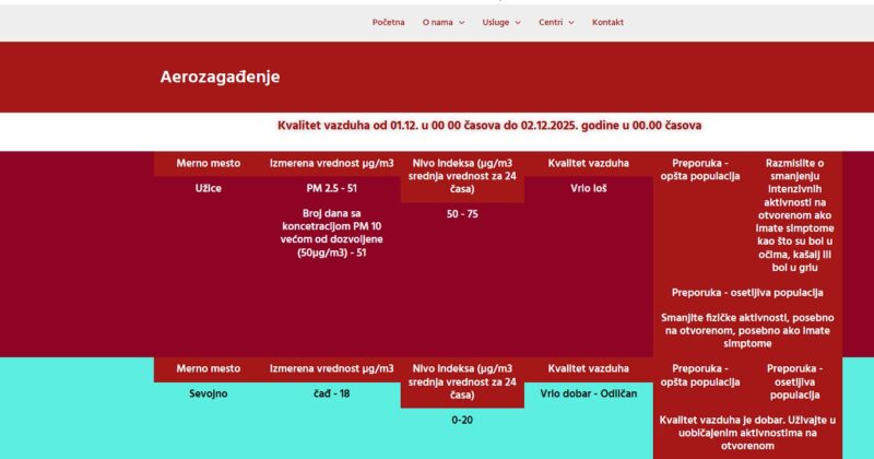 Vazduh u Užicu bio je vrlo lošeg kvalteta tokom 1. i 2. decembra, zbog prekoračenja dnevno dozvoljenih koncentracija PM 2,5 čestica, pokazuju poslednje objavljeni podaci Zavoda za javno zdravlje Užice.