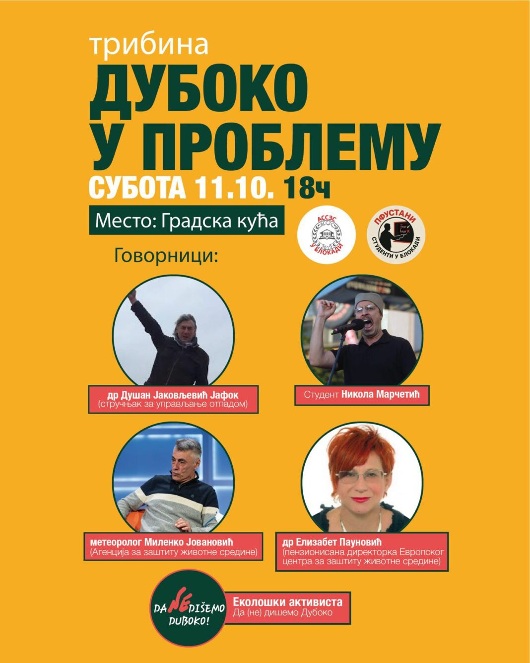 O upravljanju otpadom i zaštiti životne sredine, ekološkim problemima nakon požara u Regionalnom centru za upravljanje otpaodm Duboko govoriće dr Dušan Jakovljević Jafok, stručnjak za upravljanje otpadom, meteorolog Milenko Jovanović iz Agencije za zaštitu životne sredine, dr Elizabet Paunović, penzionisana direktorka Evropskog centra za zaštitu životne sredine, student Nikola Marčetić i predstavnik udruženja „Da (ne) dišemo Duboko“.