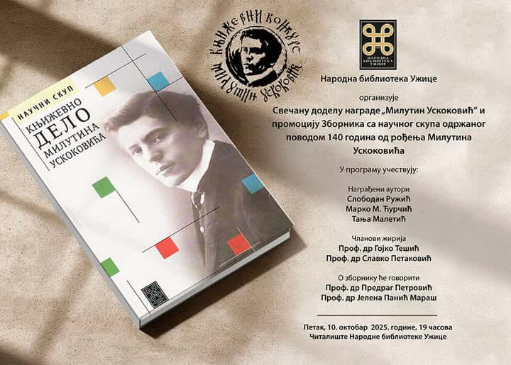 “U okviru programa biće svečano uručena Nagrada „Milutin Uskoković” za najbolju savremenu neobjavljenu pripovetku na srpskom jeziku u 2024. godini. U programu učestvuju nagrađeni autori Slobodan Ružić i Marko M. Ćurčić, kao i članovi žirija prof. dr Gojko Tešić i prof. dr Slavko Petaković. Tom prilikom predstavićemo i Zbornik sa naučnog skupa koji je Narodna biblioteka Užice organizovala u junu prošle godine u saradnji sa Pedagoškim fakultetom, povodom 140 godina od piščevog rođenja. O zborniku će govoriti prof. dr Predrag Petrović i prof. dr Jelena Panić Maraš”, naavili su iz Narodne biblioteke Užice.