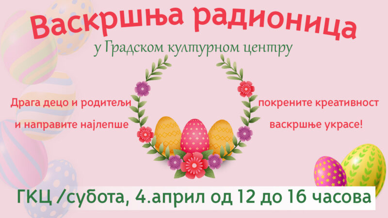 Vaskršnja radionica biće održana u subotu 4.aprila od 12 do 16h u Velikoj sali GKC-a.