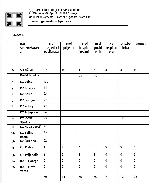 U padu je broj hospitalizovanih u bolnicama Zdravstvenog centra Užice u Zlatiborskom okrugu u odnosu na prethodni dan. Na bolničkom lečenju je 66 pacijenata, a njih 50 ima potvrđen korona virus kovid-19.