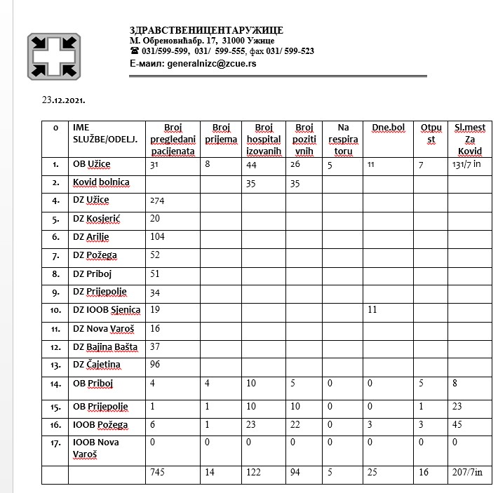 Na respiratorima u Opštoj bolnici Užice je pet hospitalizovanih, dok je na bolničkom lečenju u Zlatiborskom okrugu više od 120 ljudi, 94 sa korona virusom kovid-19.