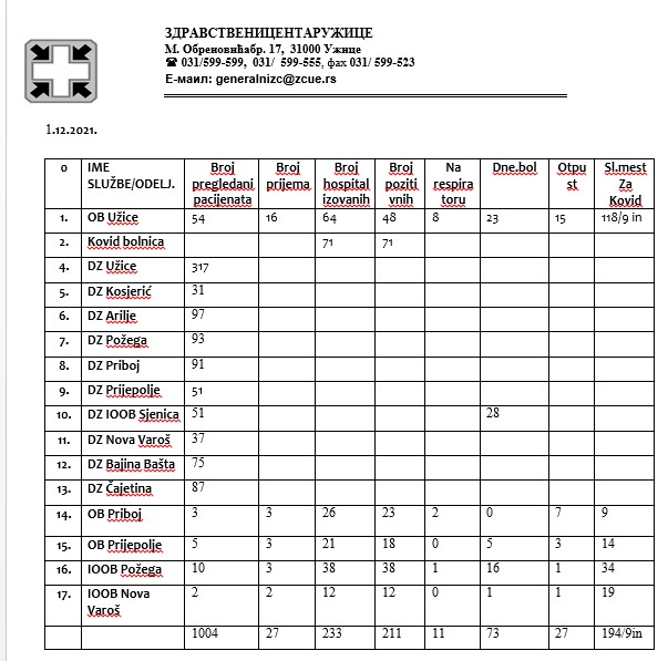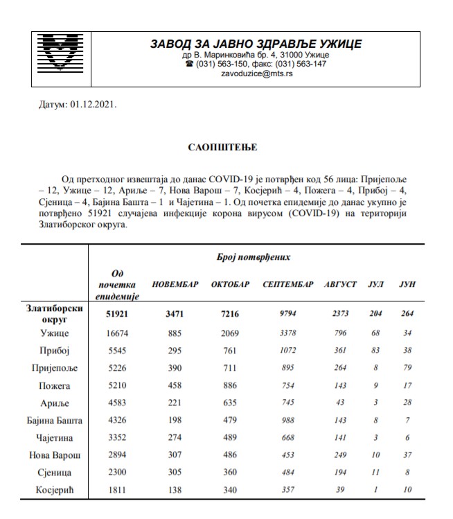 Zdravstveni centar Užice je saopštio da je na bolničkom lečenju u Zlatiborskom okrugu ovog jutra 233 pacijenata od kojih je 211 pozitivno na korona virus kovid-19.
