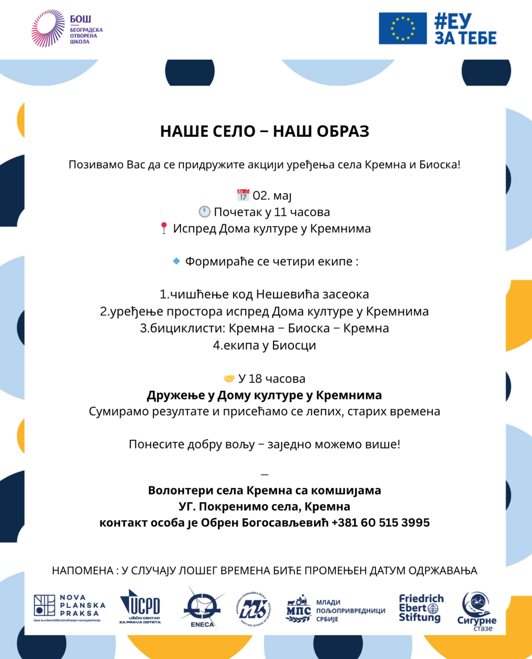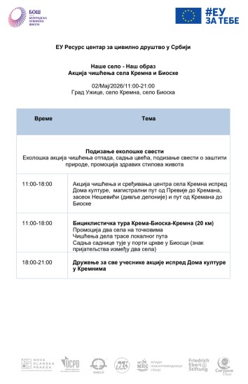Neformalna grupa organizovaće i akciju uređenja sela Kremna i Bioska u subotu, 2. maja, pod sloganom inicijative „Naše selo – naš obraz“.