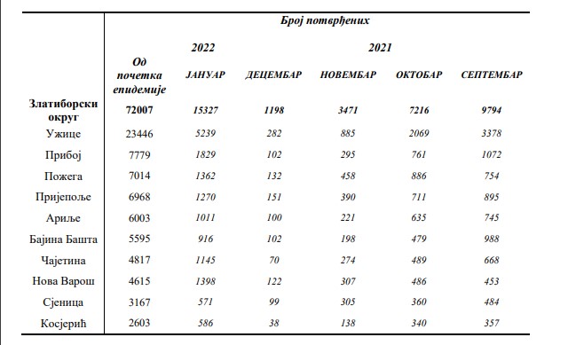 Prema podacima iz ZZJZ Užice, Prijepolje beleži 17 novoobolelih za 24 sata, Arilje – 14, Požega – 13, Nova Varoš – 12, Sjenica – 11, Čajetina