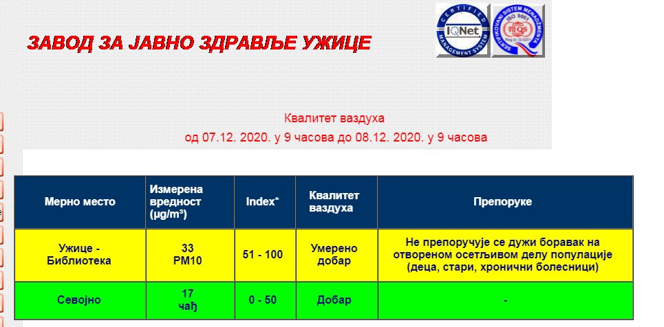 Foto screenshot ZZJZ Užice; Podaci za čađ sa merne stanice na zelenoj pijaci nisu prikazani, kao ni koncentracije sumpor dioksida i azotovih oksida.