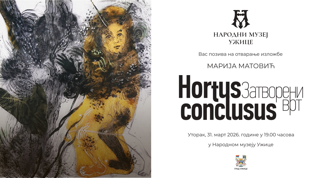 Izložba „Hortus conclusus (Zatvoreni vrt)” umetnice Marije Matović, koja istražuje odnos prirode, mita i unutrašnjih svetova kroz savremeni likovni izraz biće otvorena u utorak 31. marta sa početkom u 19 časova u Narodnom muzeju Užice.