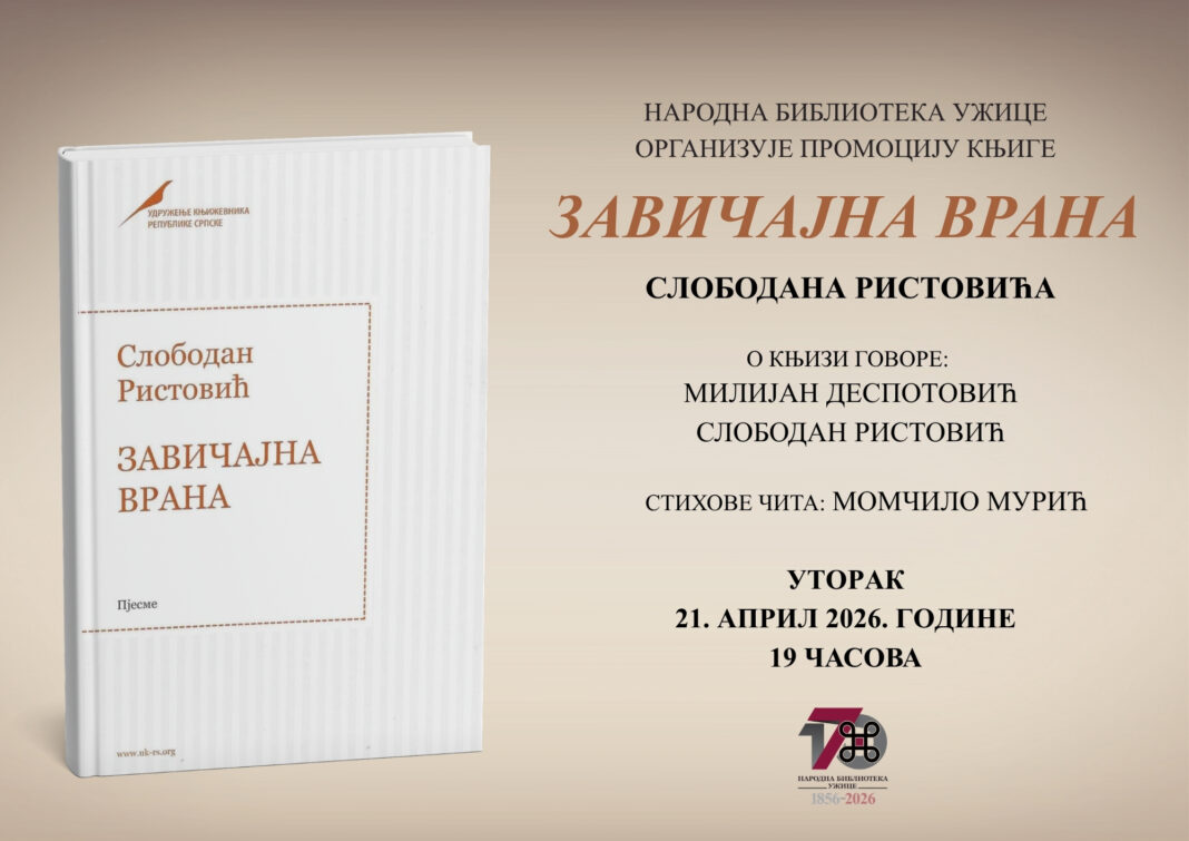 U Čitalištu Narodne biblioteke Užice, 21. aprila, sa početkom u 19 časova, biće održano predstavljanje knjige „Zavičajna vrana” autora Slobodana Ristovića.