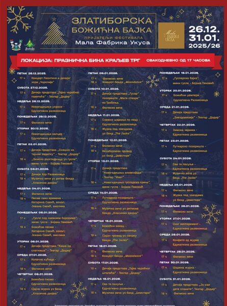 Festival „Zlatiborska božićna bajka“ na Kraljevom trgu do 31. januara ponudiće sadržaje za različite uzraste; zimski bioskop, edukativne radionice i aktivnosti za najmlađe, predstave i nastupe lokalnih muzičkih bendova. Festival organizuju Opština Čajetina i Turistička organizacija Zlatibor uz podršku restorana „Mala fabrika ukusa“.