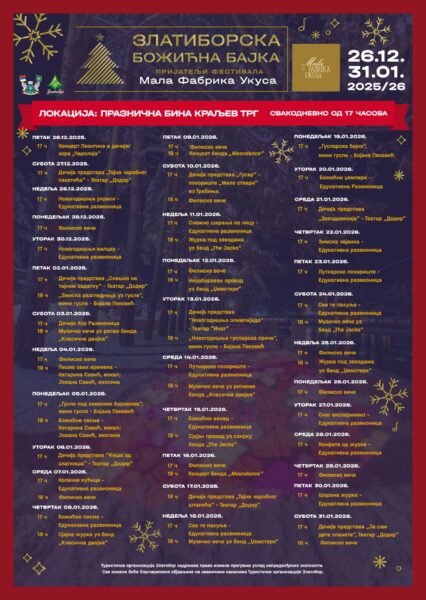 Tokom trajanja „Zlatiborske božićne bajke“, posetioci će imati priliku da uživaju u programu zimskog bioskopa, edukativnim radionicama i sadržajima za najmlađe, brojnim predstavama, ali i bogatom muzičkom programu koji će izvoditi lokalni bendovi. Uz više od mesec dana nezaboravnog prazničnog provoda, festival će učiniti Zlatibor idealnom destinacijom za novogodišnje praznike za sve generacije.