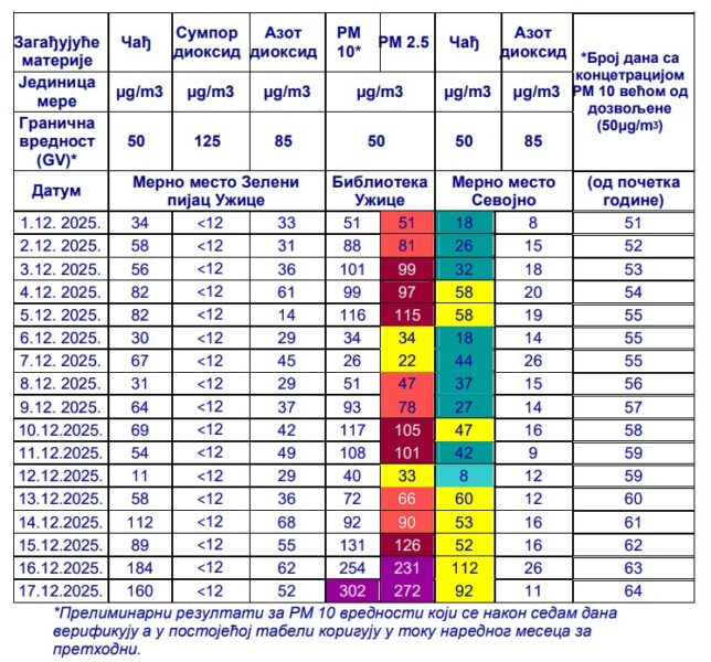 Ekstremno loš kvalitet vazduha u Užicu tokom 17. decembra registorovao je Zavod za javno zdravlje Užice u okviru loklane mreže monitoringa. Podaaci ukazuju da je bila prekoračena dnevno dozvoljena koncentracija zagađujućih čestica PM 10 i PM2,5.